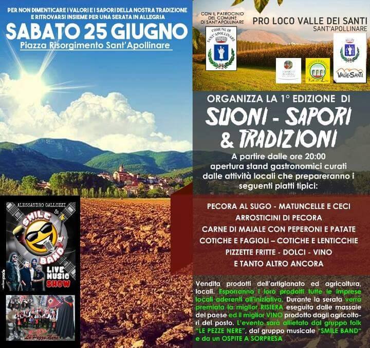 10 Giugno 2016Sabato 25 Giugno nel comune di Sant’Apollinare in provincia di Frosinone a partire dalle ore 20,00 si apriranno ufficilamente le danze per la prima edizione della manifestazione: “Suoni, sapori e tradizioni…â€, un evento enogastronomico culturale di grande rilievo.