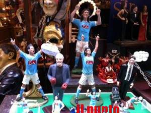 “Quest’Anno non poteva mancare il nuovo premier Mario Monti ma soprattutto Steve Jobs, l’inventore della Apple e l’indimenticabile Marco Simoncelliâ€. Dichiara Marco Ferrigno, 43 anni, discendente di una delle famiglie che ha dato grande lustro alla prestigiosa attività presepiale napoletana. Da quattro generazioni i Ferrigno costruiscono presepi divenuti famosi in tutto il mondo. “Non poteva mancare però – continua l’artigiano – la famiglia presidenziale Sarkozy ed ovviamente le stelle del calcio Napoli, da Cavani a Lavezzi, Hamsik, il Re Leone Inler, il mister Mazzarri e il presidente De Laurentis. Un occhi di riguardo anche per Fiorello, Ligabue e per il presidente della Regione Lazio Renata Polverini che è venuta in visita a Napoli proprio a Dicembreâ€. Ma non solo personaggi, nel presepe moderno entrano vere e proprie scene dell’attualità come ad esempio un Lavezzi inginocchiato davanti alla fidanzata per regalarle un orologio simile a quello rubatole durante una rapina oppure il presidente americano Obama con in mano la testa di Bin Laden. Insomma, un mestiere che comporta certamente un continuo aggiornarsi alla ricerca di personaggi ispiratori che spesso si recano nella Bottega di Ferrigno per ringraziarlo di persona. “Leggiamo molto i giornali, anche quelli di Gossip e spesso è proprio da lì che prendiamo ispirazione per il nostro lavoroâ€.