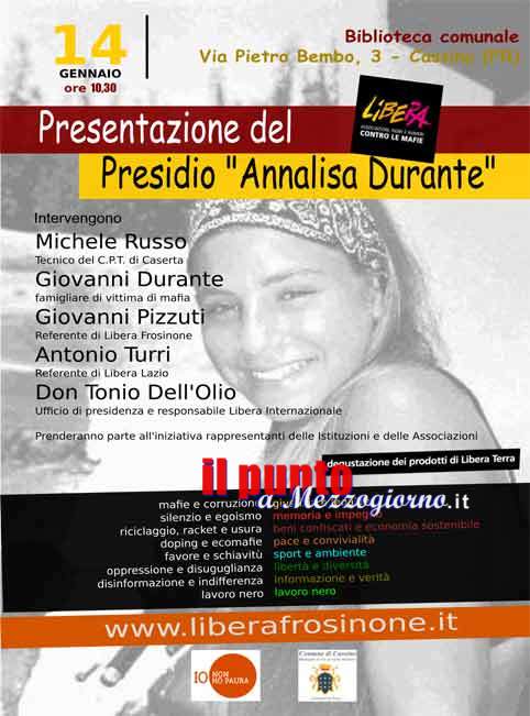 Salvatore Giuliano, esponente dell’omonimo clan, quale esecutore materiale dell’omicidio. Il clan Giuliano per decenni ha comandato nel rione napoletano di Forcella, espandendo la propria attività criminale, già negli anni novanta, nel cassinate. Nel 1993 fu prima sequestrata e poi confiscata una villa a Carmine Giuliano (nel comune di Sant’Elia Fiume Rapido) e grazie alle dichiarazioni di un ex appartenente al clan Giuliano, oggi collaboratore di giustizia, nell’estate del 2008 la DDA di Roma con, l’operazione ‘Grande Muraglia’, ha arrestato diverse persone, tra cui noti imprenditori del cassinate”. “Il nuovo Presidio sarà sicuramente un segnale forte nella nostra provincia” dichiara Giovanni Pizzuti, referente provinciale di Libera. Fanno parte del presidio: il circolo Vas, l’ass. Pubblicamente, la C.N.G.E.I.e la cooperativa I Naviganti. Alla presentazione sono stati invitati le autorità locali e provinciali. Presente, ovviamente, anche il Comune di Cassino ed in particolare l’assessore Danilo Grossi che da subito ha sposato il progetto di Libera: “Mi fa veramente piacere che nell’anno delle prime edizioni e dopo l’avvio, a settembre, del progetto ‘Io Non Ho Paura’, finalmente si giunga anche a Cassino all’inaugurazione di un presidio da parte di un’associazione, Libera, che da anni si distingue per la lotta contro la criminalità organizzata. Per Cassino questo nuovo presidio dovrà essere un punto di riferimento non solo locale, ma anche nazionale, visti anche gli ottimi risultati che Libera ha ottenuto in questo campo. La nostra è una terra di confine e come tale in passato è stata oggetto di infiltrazioni si stampo malavitoso, ma oggi grazie al costante lavoro che stanno portando avanti in maniera congiunta Istituzioni e Forze dell’Ordine, si è registrata già un’inversione di tendenza ed avere, anche nella nostra città, un presidio di Libera, è sicuramente una garanzia in più per tutto il territorio.” Durante l’evento interverranno: Michele Russo, tecnico C.P.T. di Caserta ed ex sindacalista che durante la costruzione della terza corsia dell’autostrada fu vittima di un agguato; Antonio Turri, referente regionale di Libera; Giovanni Pizzuti, referente provinciale di Libera; Don Tonio Dell’Olio, membro dell’ufficio di presidenza e responsabile del settore internazionale di Libera; e Giovanni Durante, padre di Annalisa.