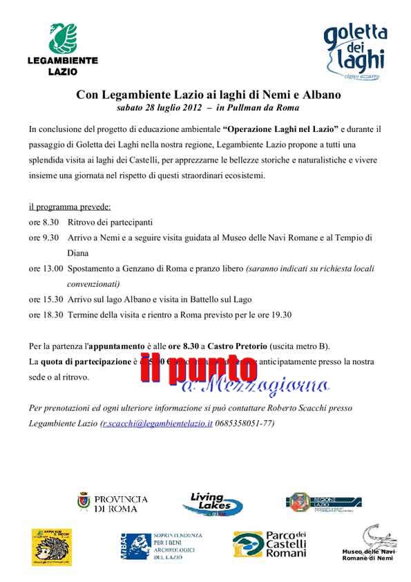 Ai laghi di Nemi e Albano una splendida visita per dare il benvenuto alla Goletta dei Laghi nella nostra regione. Durante la giornata sono previste a Nemi visite guidate al Museo delle Navi, recentemente ristrutturato in tutta la sua bellezza dalla Soprintendenza Archeologica del Lazio, e al Tempio di Diana, enorme complesso che si allargava su una superficie di oltre 5.000 mq. Terminate le visite ci si sposterà sul lago di Albano, dove è prevista una visita in battello sul lago prima del rientro. Quota di partecipazione 5,00 € tutto incluso. Appuntamento per la partenza ore 8.30, a Castro Pretorio (uscita metro B). Per info e prenotazioni chiamare 06/85358051.
