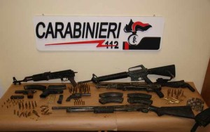 Nel corso di tale attività investigativa, i militari dell’Arma hanno rinvenuto un intero arsenale occultato all’interno di alcuni sacchi neri sotto circa 50 centimetri di terreno di pertinenza dei giardini di due villette site in Casal di Principe. Si tratta di numerose armi comuni da sparo, armi da guerra, fucili e numeroso munizionamento tutto in ottimo stato di conservazione. In particolare sono state sequestrate 3 pistole di cui 2 con matricola abrasa, 1 pistola mitragliatrice, con matricola abrasa, 1 fucile a pompa, con matricola abrasa, 2 kalashnikov, ed un fucile d’assalto-mitragliatore, completo di caricatore, nonché il seguente munizionamento: 89 cartucce calibro 7,62, 18 cartucce calibro 12, 19 cartucce calibro 38, 50 cartucce calibro 9,21, 6 cartucce calibro 38S e 4 cartucce calibro 7,65.
