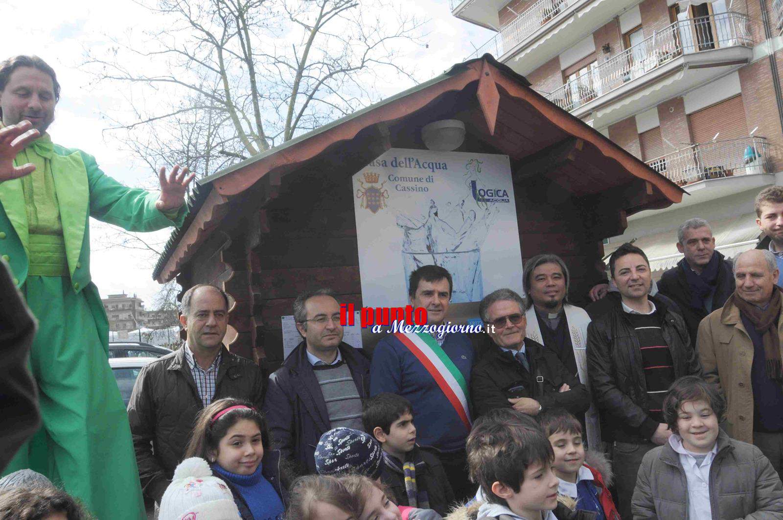 Significa inoltre tornare ad utilizzare l’acquedotto nella sua funzione originale, e bere un’acqua a “chilometro zero” con un giusto equilibrio di sali minerali; confronta tu stesso le analisi dell’acqua, periodicamente esposte presso la postazione.  “E’ un iniziativa che guarda alla salvaguardia ambientale – ha concluso l’assessore all’ambiente Riccardo Consales – ed è una delle misure, introdotte nel progetto “Cassino riusa” approvato dalla Regione Lazio nel mese di dicembre, volte alla riduzione a monte degli imballaggi.  Prendere acqua alle casette vuol dire risparmiare migliaia di bottiglie di plastica, riavvicinando i cittadini ad un uso consapevole dell’acqua di rubinetto, oggi preferita da milioni di famiglie italiane a quella in bottiglia.  “Significa anche eliminare l’inquinamento del trasporto su gomma – ha aggiunto il sindaco Giuseppe Golini Petrarcone – e  quindi aiuta a migliorare la qualità dell’aria. Ma soprattutto per chi non può far a meno dell’acqua in bottiglia, è un notevole risparmio per le famiglie valutato all’incirca sui 165 € l’anno”. Questa sarà la prima casa dell’acqua, poi con il tempo verranno installate altri due erogatori in altre piazze della città di Cassino. Un momento importante, allietato dall’animazione della cooperativa ‘I Naviganti’ alle scolaresche presenti.