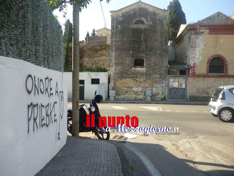 20 Ottobre 2013“Onore a Priebkeâ€, la scritta con vernice nera ben risalta su un muro bianco in via Vittorio Bachelet all’incrocio con via Garibaldi, proprio di fronte al cimitero di epoca borbonica della città . Al fianco della scritta un simbolo che non sembra appartenere a nessun gruppo di destra. La circostanza è stata segnalata al commissariato di polizia di Gaeta.