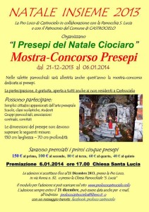Anche quest’anno la Pro Loco di Castrocielo, nell’ambito del “Natale Insieme 2013â€, in collaborazione con la parrocchia Santa Lucia e con il patrocinio del comune di Castrocielo organizza la mostra-concorso presepiale “I Presepi del Natale Ciociaro.