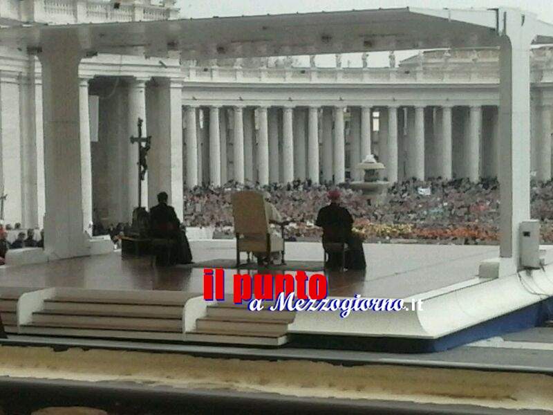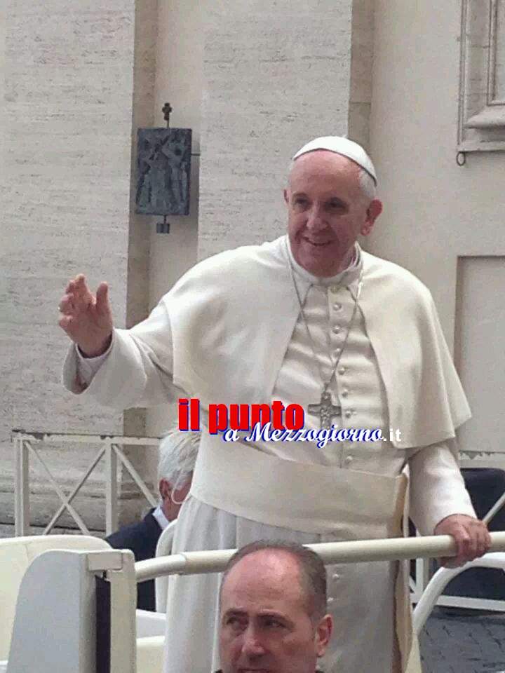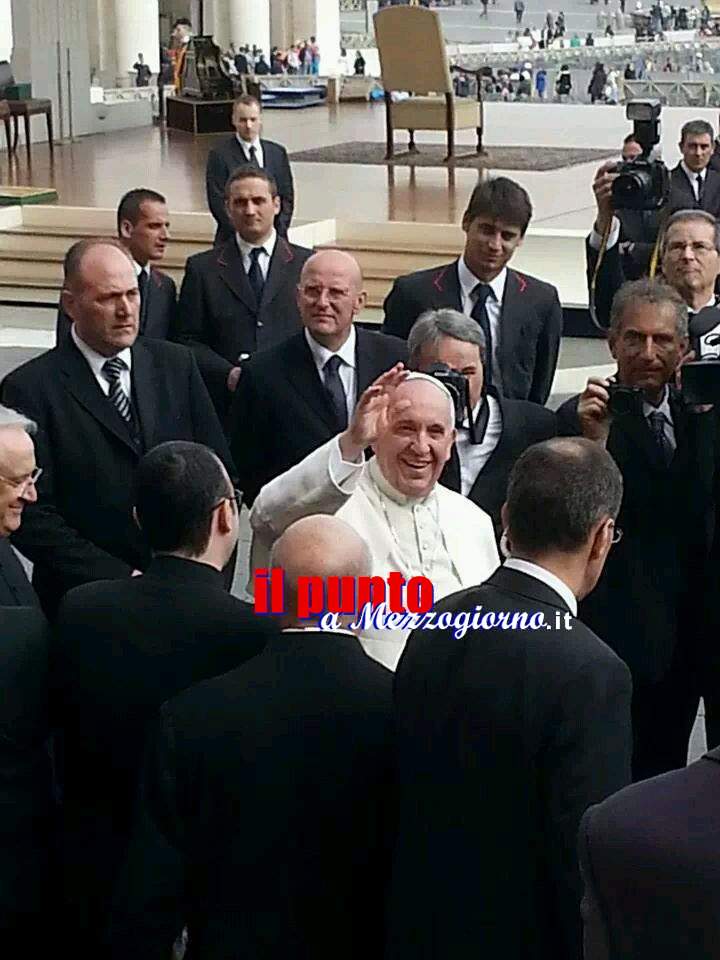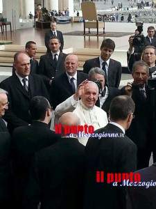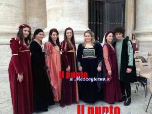 Ben centocinquanta figuranti del Corteo Storico, tra militi, nobili e popolani, e molti atleti del Cus Cassino in qualità di tedofori hanno potuto finalmente partecipare all’udienza dal sagrato della basilica, offrendo uno splendido ed inconsueto colpo d’occhio. Il nutrito gruppo, solo del Corteo quattro pullman, è stato nominato tra i partecipanti all’udienza, e il Santo Padre ha benedetto l’iniziativa di Pace ringraziando le tre città benedettine. Entusiasmo alle stelle, applausi e acclamazioni a Papa Francesco, dal quale i figuranti desideravano forse un saluto speciale più ravvicinato, ma il giro fatto tra i suoi “preferiti”, i numerosi malati e gli sposi novelli, aveva esaurito il pur lungo tempo messo a disposizione. Il saluto finale, però, mentre si allontanava con la papamobile, è stato alquanto ravvicinato e soddisfacente. Quindi, dopo le 13,00, il Corteo Storico ha lasciato la piazza sfilando per via della Conciliazione e suscitando curiosità , interesse e ammirazione unanime e stimolando infiniti click fotografici ma anche, va detto, qualche coro di protesta a suon di clacson da parte di automobilisti frettolosi.
