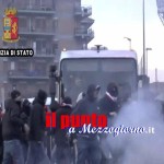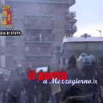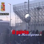 Il cordone di sicurezza attivato dalle Forze di Polizia riesce a contenere gli ultras perugini che, travisati ed armati di oggetti contundenti, lanciano bottiglie e petardi contro i poliziotti per cercare di sfondare lo sbarramento.