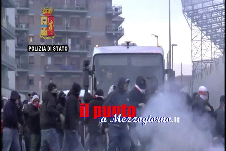 Parte la carovana dei 900 tifosi ospiti, ma durante il percorso, tre pullman si fermano e scendono alcuni tifosi di “fascia c†che cercano di aggredire i passanti e lanciano oggetti contro le auto in sosta.