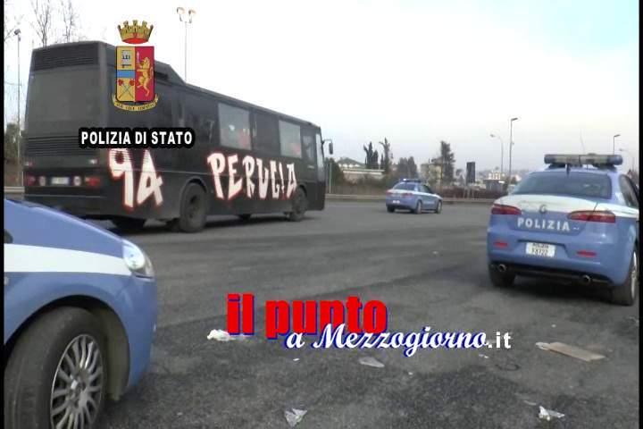 Il cordone di sicurezza attivato dalle Forze di Polizia riesce a contenere gli ultras perugini che, travisati ed armati di oggetti contundenti, lanciano bottiglie e petardi contro i poliziotti per cercare di sfondare lo sbarramento.
