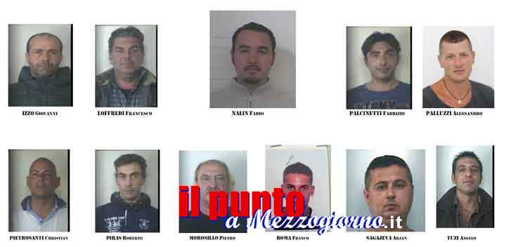 Gli arrestati sono: BATTISTI Stefano, 44enne di Sezze; CAPODIFERRO David, 39enne di Priverno; CIAMPINI Celestino, 30enne di Sezze; CIRILLI Maurizio,52ennedi Sezze; COMPAGNO Federico, 28enne di Sezze; D’ANGELO Giuseppe, 42 enne di Santa Croce del Sannio (BN); DE SANTIS Fabio, 48enne di Sezze; DE SANTIS Piero, 50enne di Sezze; GAVILLUCCI Alessandro, 28 enne di Sezze; GORI Daniele, 32enne di Sezze; IZZO Giovanni, 48enne di Latina; LOFFREDI Francesco,46enne di Sezze; MOROSILLO Pietro, 68enne di Sezze; PALCINETTI Fabrizio, 37enne di Sezze; PALLUZZI Alessandro, 42enne di Frosinone; PIETROSANTI Christian, 43enne di Latina; PIRAS Roberto, 39enne di Terracina; ROMA Franco,28enne di Sezze; SAGAJEVA Arjan 32enne di Lushnje (Albania); TUZI Angelo, 42enne di Sezze.