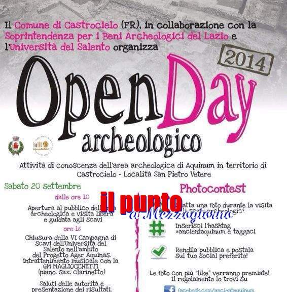 20 Settembre 2014Porte aperte oggi e domani per il sito archeologico di Aquinum. A conclusione della campagna di scavi, coordinata dal professor Giuseppe Ceraudo dell’Università degli studi del Salento, sarà possibile visitare l’area in via San Pietro Vetere. Per gli appassionati di storia antica le sorprese non mancheranno. Questa nuova tranche di lavori ha permesso di far emergere nuovi tesori come i mosaici di un ambiente termale che rappresentano animali marini fantastici. La novità assoluta è il tracciato della via romana rinvenuto accanto ai resti di quella che potrebbe essere l’abside di una basilica. Inoltre, in occasione dell’open day tutti i visitatori potranno partecipare al photocontest. Le foto scattate durante la visita agli scavi archeologici potranno essere condivise sui social network e l’immagine che avrà collezionato il maggior numero di like verrà premiata.