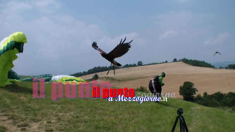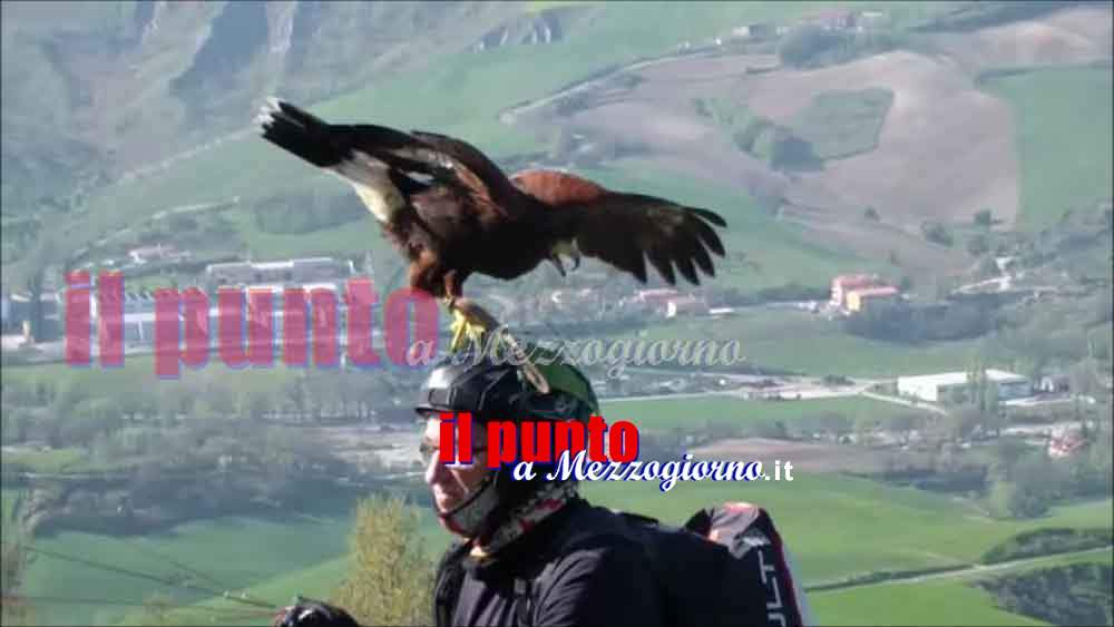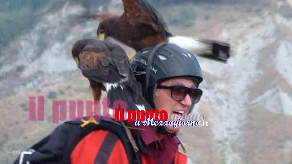 Vola con i falchi, si lancia con il parapendio seguito dai suoi rapaci