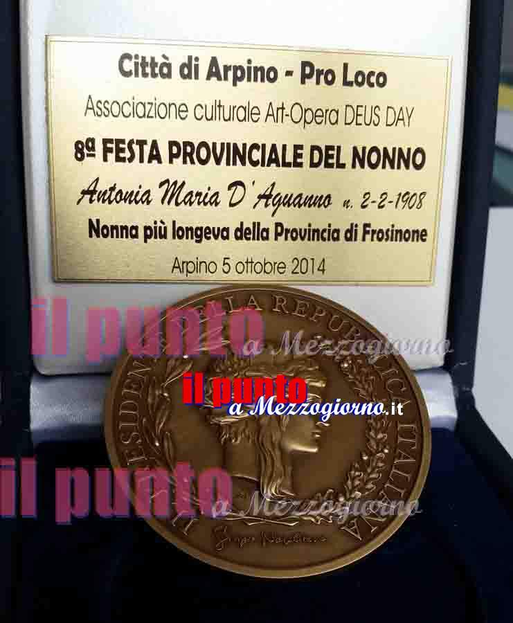 8 Febbraio 2015E’ “nonna della Ciociariaâ€, ma non lo sa e la medaglia che la Presidenza della Repubblica le ha inviato tramite l’associazione culturale Art-Opera Deus Day , non le è stata consegnata per circostanze sfortunate. Antonia Maria D’Aguanno ha festeggiato il due febbraio i suoi 107 anni di età ed è la donna “più adulta†della provincia di Frosinone.