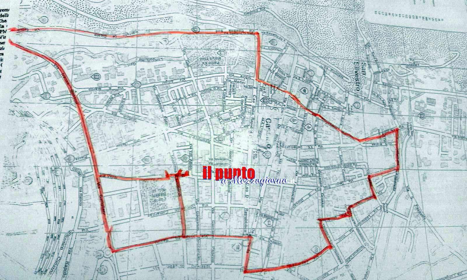 Questo il perimetro nel quale non si circola: da incrocio Via S. Angelo – Via Porta Paldi – Via Di Biasio – C.so della Repubblica fino a Piazza Toti – Via Marconi – Largo Molise – Via Molise – Via T. Campanella – Via Degli Eroi – Via Telesio – Via Vespucci – – Piazza Gramsci – Via C. Colombo fino a Piazza Restagno – Piazza Restagno – Via Zamosh – Via E. De Nicola (ad attraversare per Via Bellini) – Via Bellini – Via Leopardi – Via Verdi con accesso a Piazza Green e Ex Campo Miranda – Via Garigliano – Piazza Garibaldi –- Viale Bonomi fino all’incrocio con Via S.Angelo – Porta Paldi