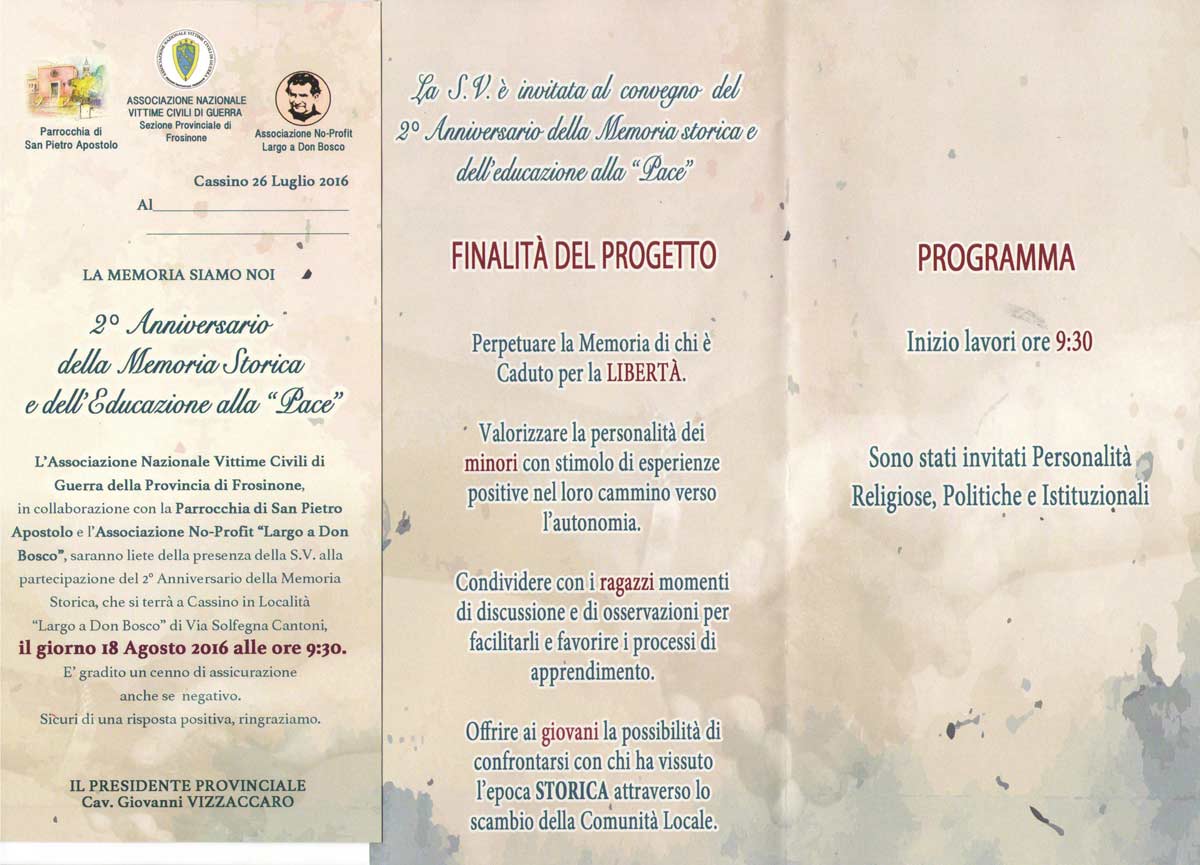 8 Agosto 2016Cassino – La pace non si racconta, non si commenta, ma si costruisce attraverso quei sentimenti di fratellanza e di umana solidarietà che le comunità per prime devono coltivare. La pace costruisce ponti culturali sui fiumi della memoria ed è questo quello che da oltre 70 anni fa l’Associazione Nazionale Vittime Civili di Guerra. Trasformare la sofferenza delle singole vittime in semi di pace è la forza dell’Anvcg sezione provinciale di Frosinone e l’impegno del suo presidente Giovanni Vizzaccaro.