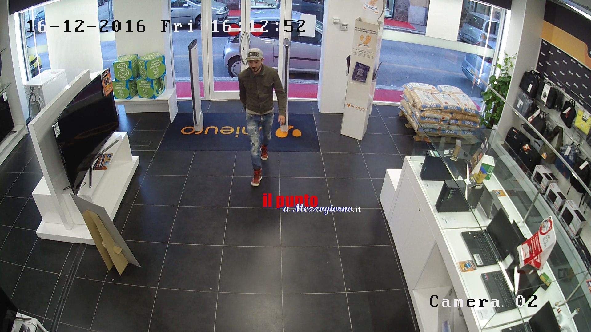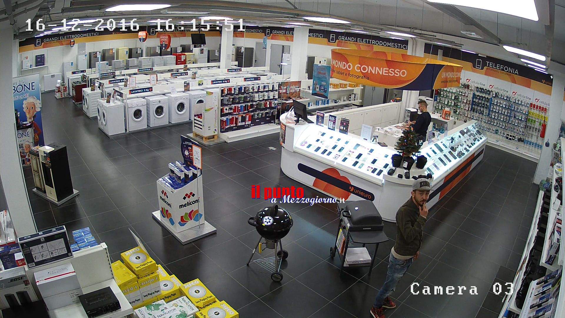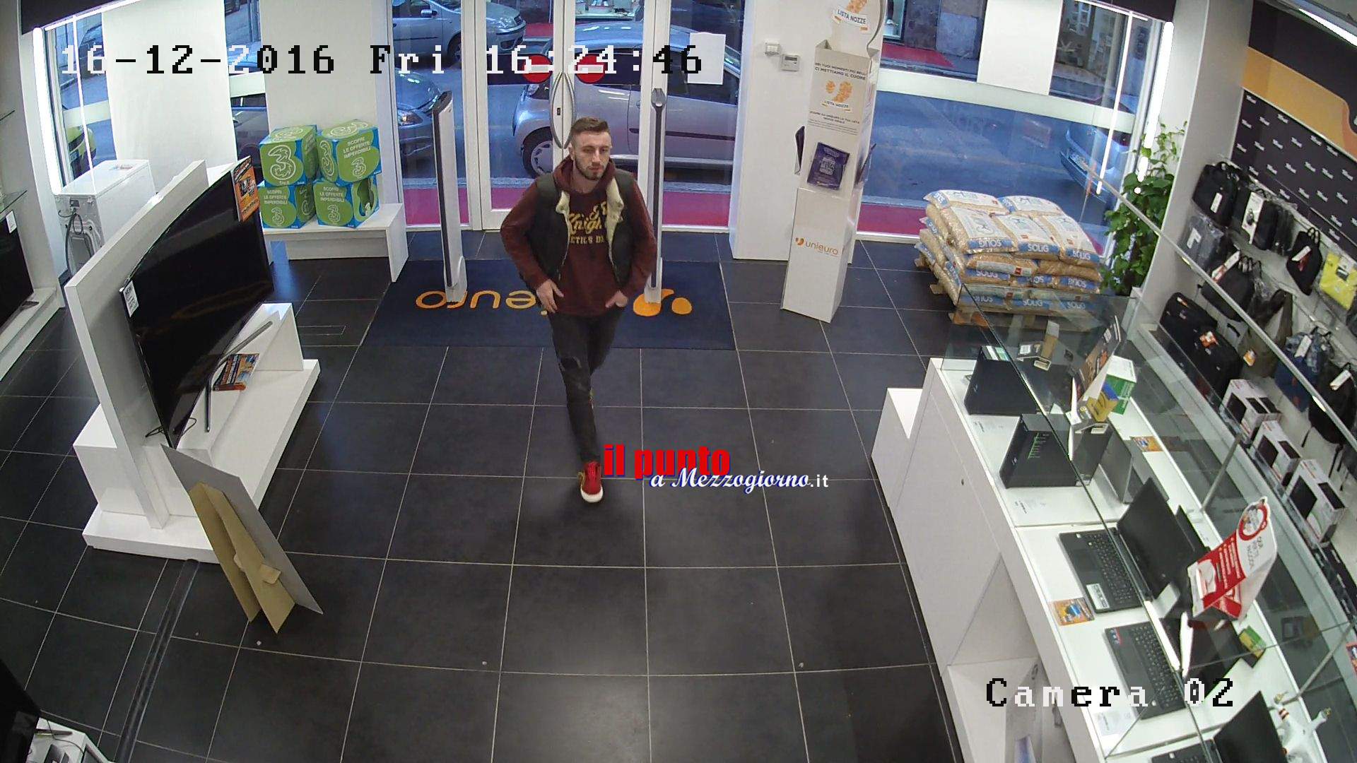 Il video registrato ieri dalle telecamere a circuito interno del negozi Unieuro in via Arigni a Cassino illustra perfettamente come agiscono i malviventi per non attirare l’attenzione tra gli scaffali e per portare via centinaia di euro in merce.