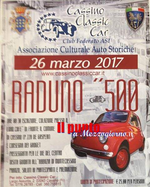 16 Marzo 2017Con l’avvento della primavera gli appassionati collezionisti rimuovono i teli protettivi dalle loro autovetture pronti a partecipare a eventi motoristici come quello che domenica 26 marzo 2017 si rinnoverà con l’appuntamento del RADUNO 500, kermesse di apertura degli incontri sempre molto partecipati, organizzati dall’’Associazione Culturale Auto Storiche “Cassino Classic Car†del presidente Agostino De Martino. Il raduno riservato alla mitica vettura Fiat sarà accessibile anche alle bicilindriche derivate Abarth e Giannini.