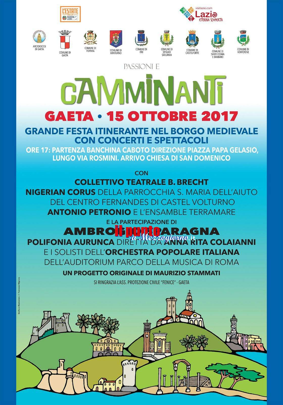 13 Ottobre 2017Gaeta – Domenica 15 ottobre spettacolare evento di chiusura di “Passioni e Camminanti”, la grande rassegna che da Luglio ad Ottobre ha coinvolto otto borghi dell’area distrettuale che si snodano lungo il percorso dell’Appia Antica: Gaeta (ente capofila), Formia, Minturno, Itri, Spigno Saturnia, Castelforte, SS. Cosma e Damiano e Ventotene. Dalle feste tradizionali ad eventi creati a misura di borgo, dalle maschere camminanti della commedia dell’arte alla letteratura del ‘900, dal mare alla montagna fino alle isole, dalle parate di strada alle piazze: un progetto di rete che ha valorizzato le memorie, le storie, i profumi, le tradizioni, le bellezze di pietra, di terra e di acqua dei nostri centri storici vivendo le vibrazioni dei concerti con artisti popolari e giovani musicisti, le emozioni degli spettacoli teatrali, immersi nei suoni e nei sapori della cultura pastorale o marinara che caratterizza le località del comprensorio. Sostenuto dall’Agenzia del Turismo Regione Lazio, questa iniziativa di rete, unica nel suo genere in quanto vede uniti 8 comuni, è stata finanziata dal governo regionale per una somma complessiva di 50.000 euro.