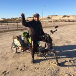 Quello è stato l’unico percorso coperto senza pedalare, tutto il resto lo ha fatto in sella alla sua bici trainando un carrellino su cui trasporta la tenda da campeggio, un sacco a pelo, gli indumenti di ricambio, le scorte alimentari e i farmaci che deve assumere quotidianamente in seguito ad una operazione alla tiroide subita qualche anno fa.