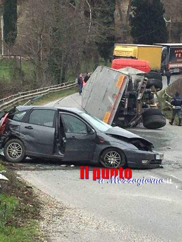 Il camion, giunto al chilometro 30, in piena curva, si è ribaltato travolgendo l’auto. Il carico ha invaso la strada e per questo, oltre al tempo necessario per i soccorsi, è stato necessario mantenere bloccato il traffico anche per permettere la rimozione del materiale dall’asfalto.