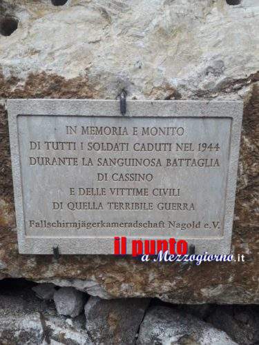 La stele posto sul marciapiede in via Di Biasio, questa mattina è stata sostituita e al suo posto sono rimaste alcuni grossi basamenti in pietra su cui sono state poste tre targhe con testo in italiano, inglese e tedesco che recitano: “In memoria e monito di tutti i soldati caduti nel 1944 durante la sanguinosa battaglia di Cassino e delle vittime civili di quella terribile guerra”.