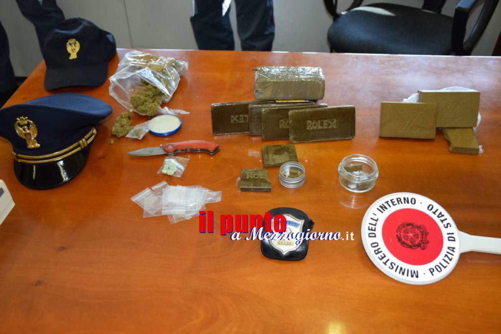 31 Luglio 2018FROSINONE – Un chilo e 600 grammi di droga, tra cocaina hashish, mariujana e shaboo (quest’ultima una pericolosissima droga sintetica, dieci volte più potente della cocaina, con effetti choc sul corpo, a base di metanfetamina), è il bilancio di una operazione antidroga svolta dalla squadra volante della questura di Frosinone.