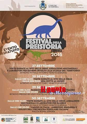 26 Settembre 2018ESPERIA – Dopo il successo dello scorso anno, che ha portato all’attenzione nazionale il sito delle orme di dinosauro di Esperia, ritorna con tante sorprese la seconda edizione del Festival della Preistoria, in programmazione dal 27 al 30 settembre.