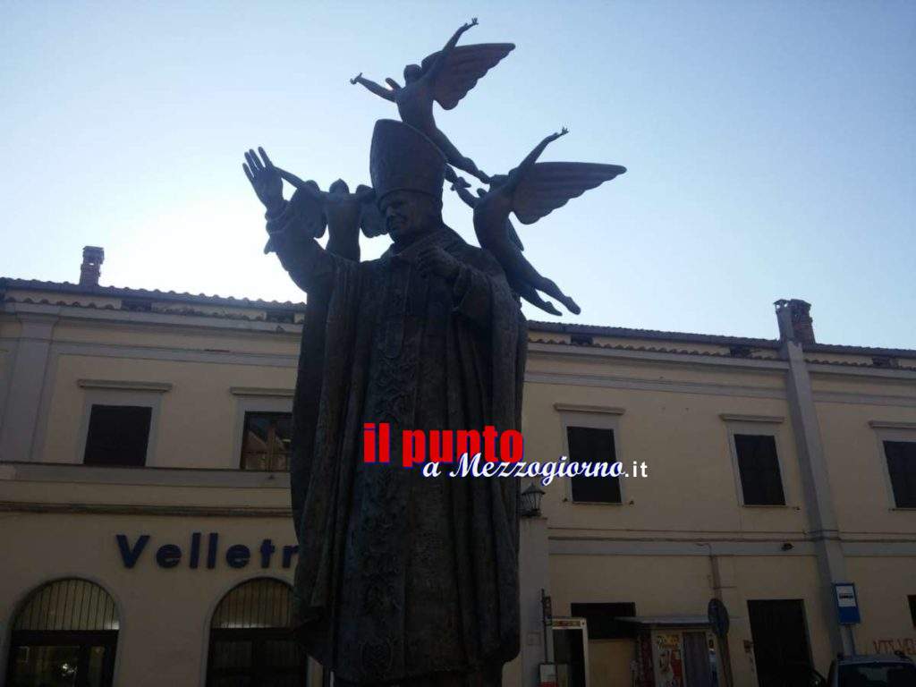 14 Settembre 2018VELLETRI – Vandalizzata a Velletri la statua di papa Giovanni Paolo II. La struttura bronzea inaugurata a Giugno nella piazza antistante la Stazione Ferroviaria è stata privata del bastone pastorale che l’effige del Pontefice Polacco aveva in mano.