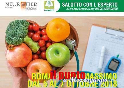 4 Ottobre 2018ROMA – “In occasione dell’iniziativa Villaggio Coldiretti, presso il Circo Massimo di Roma dal 5 al 7 ottobre, l’I.R.C.C.S. Neuromed propone alla cittadinanza un momento da dedicare al corretto stile di vita. Torna il “Salotto con l’Esperto” che nella scorsa edizione ha visto una grande partecipazione di pubblico. L’evento è dedicato alla sana alimentazione e al corretto stile di vita come arma di prevenzione contro le principali patologie che affliggono il mondo occidentale”.