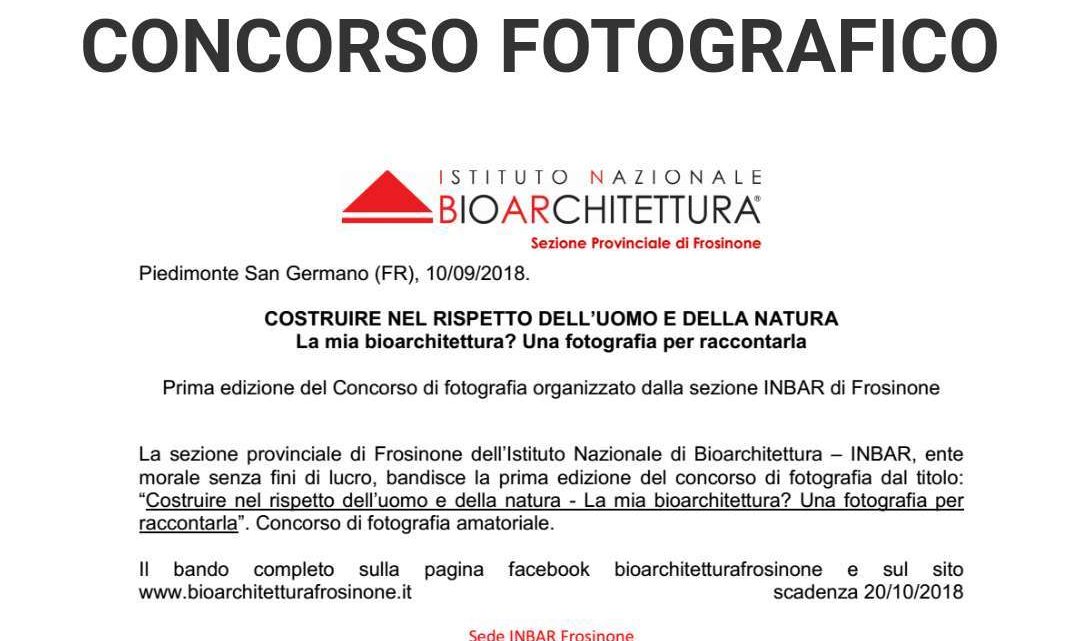 17 Ottobre 2018 1 Di redazioneL’istituto nazionale di Bioarchitettura, sezione provinciale di Frosinone, noto come Inbar, ente morale senza fini di lucro, bandisce la prima edizione del concorso fotografico dal titolo “Costruire nel rispetto della natura e dell’uomo. La mia bioarchitettura? una fotografia per raccontarla”. Si tratta di un concorso fotografico amatoriale ed è possibile consultare il bando sul sito internet www.bioarchitetturafrosinone.it oppure sulla pagina Facebook bioarchitetturafrosinone. La scadenza del bando è fissata per il 20 ottobre 2018. Un appuntamento da non perdere, dunque, per gli amanti della fotografia e della bioarchitettura.