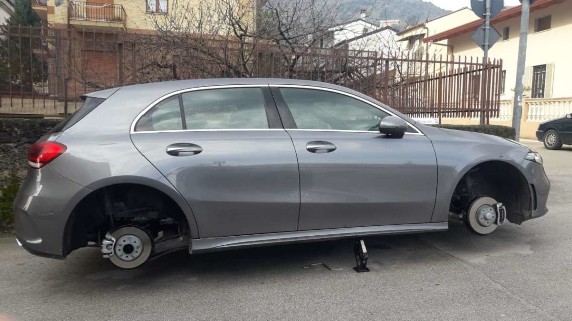 I ladri, indisturbati, dall’oscurità della notte hanno avuto il tempo di sollevare l’auto con gli arnesi giusti, smontare le ruote complete e poggiare la vettura su dei sostegni.