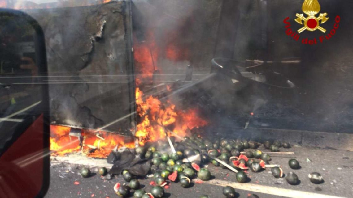 Un autoarticolato è andato in fiamme sull’autostrada. Il fatto è avvenuto oggi pomeriggio all’altezza del km 690 sulla corsia Nord tra Caianello e San Vittore. Sul posto immediato l’intervento dei vigili del fuoco, in supporto ABP della centrale, del distaccamento di Cassino e del Comando di Caserta. Il mezzo trasportava generi alimentari, angurie nello specifico. Fortunatamente l’autista del camion non ha riportato ferite. Si sono registrate code come segnalato anche da autostrade per l’Italia.