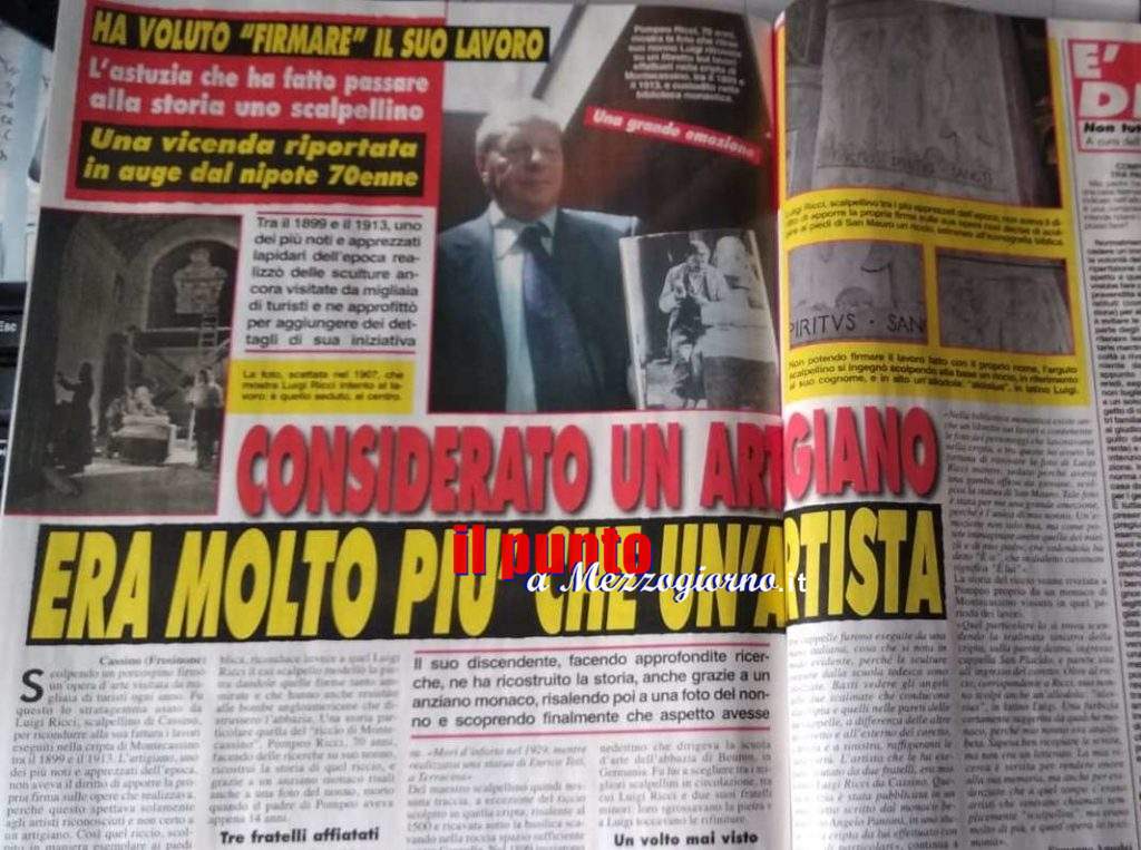 “Nelle foto ebbi la fortuna di ritrovare la foto di Luigi Ricci mentre, da seduto perché aveva una gamba offesa da giovane, scolpiva la statua di San Mauro. Tale foto è stata per me una grande emozione, perché è l’unica foto di mio nonno. Emozione non solo mia ma anche e soprattutto quella dei miei zii e di mio padre. Quando quest’ultimo la vide disse: ‘E’ is’ che in dialetto cassinate significa ‘E’ lui’”.