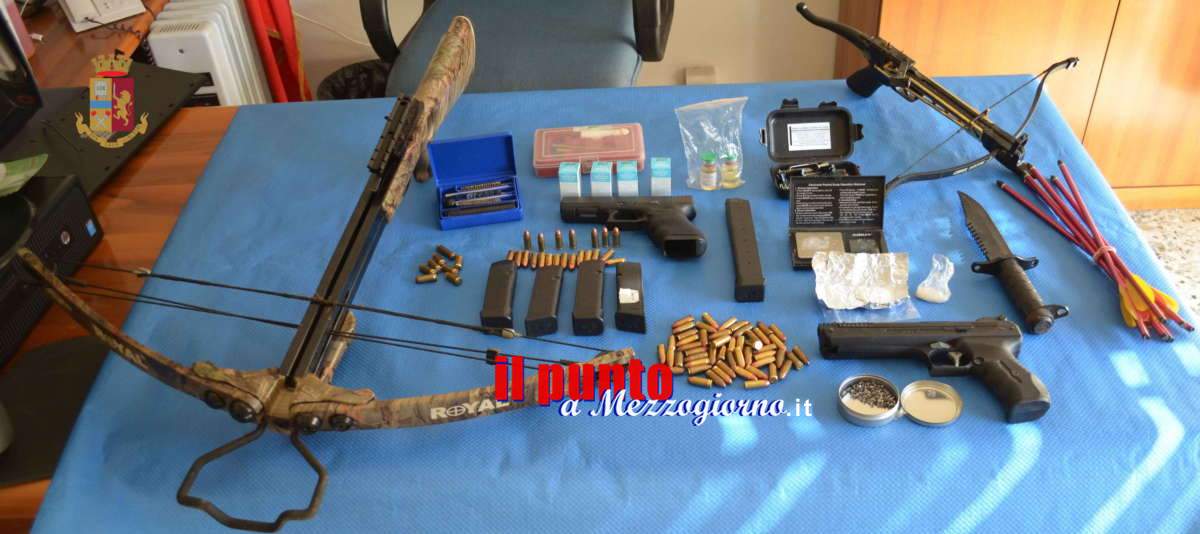 Nella sua abitazione, infatti, gli agenti del commissariato di velletri hanno trovato una pistola Glock, camerata con una cartuccia e rifornita con un caricatore con 17 cartucce, una pistola ad aria compressa munita di pallini, due balestre, 6 frecce, un pugnale di colore nero, due kit per la pulizia delle armi. Nella camera da letto poi, sono stati trovati 9.60 grammi di cocaina, un bilancino di precisione e sostanze dopanti.