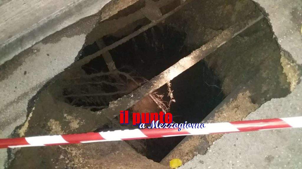 Il buco è largo circa un metro quadro e da accesso ad un vuoto nascosto dal sottile manto stradale, scavato probabilmente dallo scorrere dell’acqua.
