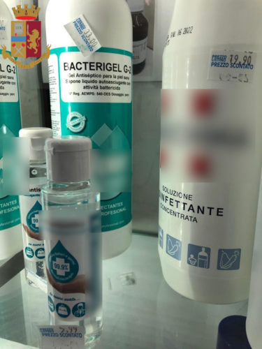 ntità di prodotti che i farmacisti avevano accumulato. Gli stessi non solo si erano riforniti tramite le consuete ditte all’ingrosso, ma avevano addirittura svuotato i vicini supermercati di prodotti per la sanificazione della casa. Infatti sono stati trovati numerosi flaconi per lavare e disinfettare le superfici con marchi di una catena di supermercati locali, acquistati, come da fattura del 24 febbraio, ad un prezzo di 81 centesimi l’uno e messi in vendita al pubblico a 8 euro ciascuno. In tutto sono stati sequestrati oltre 4 mila articoli, tra disinfettanti, guanti ed occhiali protettivi.