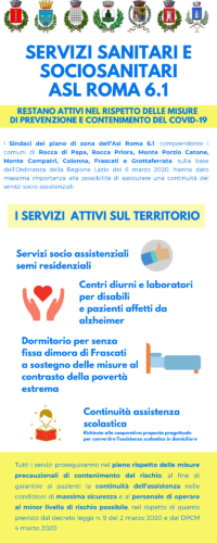 8 Marzo 2020I servizi socioassistenziali e di contrasto alla povertà estrema come l’assistenza scolastica, i servizi socio assistenziali semi residenziali, i centri diurni e i laboratori per disabili e pazienti affetti da alzheimer restano attivi nei Comuni di Rocca di Papa, Rocca Priora, Monte Porzio Catone, Monte Compatri, Colonna, Frascati e Grottaferrata.