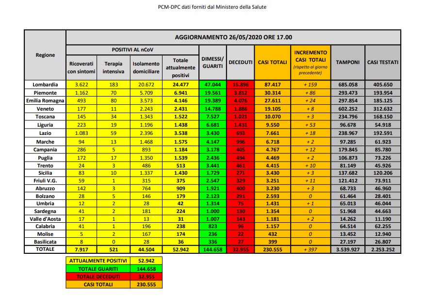 In particolare, nell’ambito del monitoraggio sanitario relativo alla diffusione del Coronavirus sul nostro territorio, a oggi, 26 maggio, il totale delle persone che hanno contratto il virus è di 230.555, con un incremento rispetto a ieri di 397 nuovi casi.