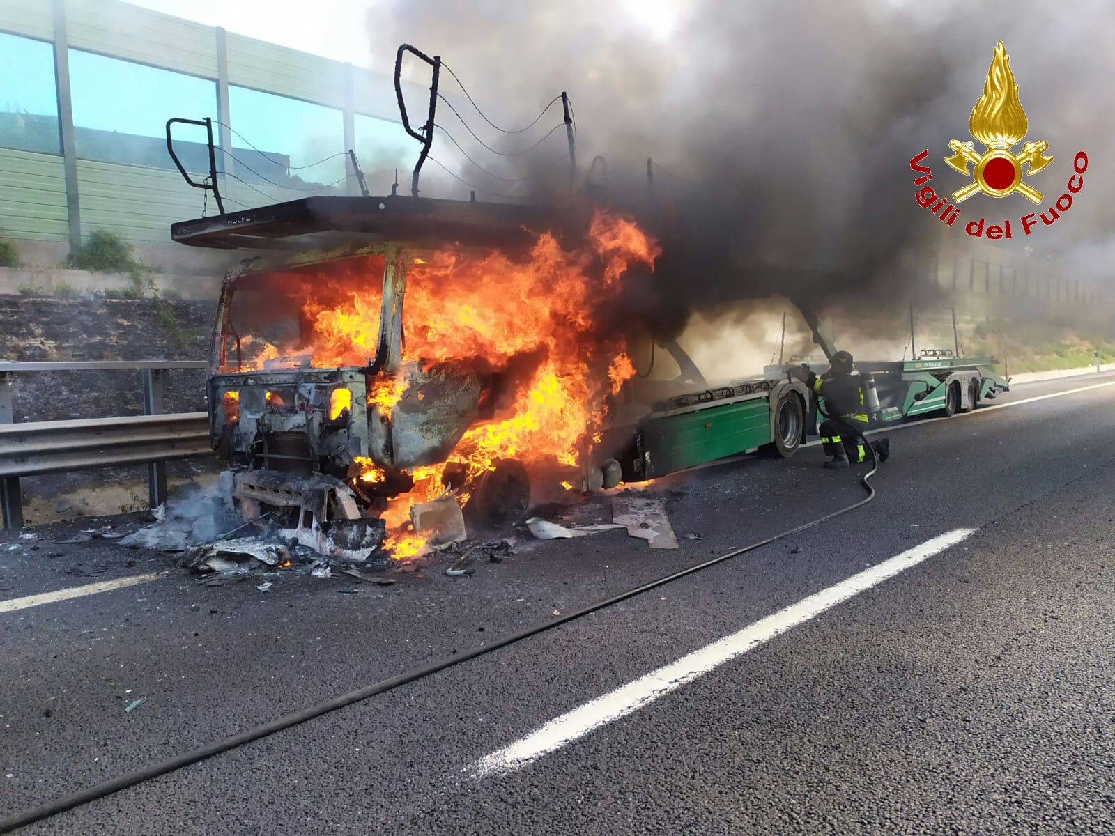 I Vigili del Fuoco, allertati dalla Polstrada, sono accorsi sul posto per domare le fiamme altissime che hanno avvolto la motrice di un mezzo pesante adibito al trasporto di autovetture.