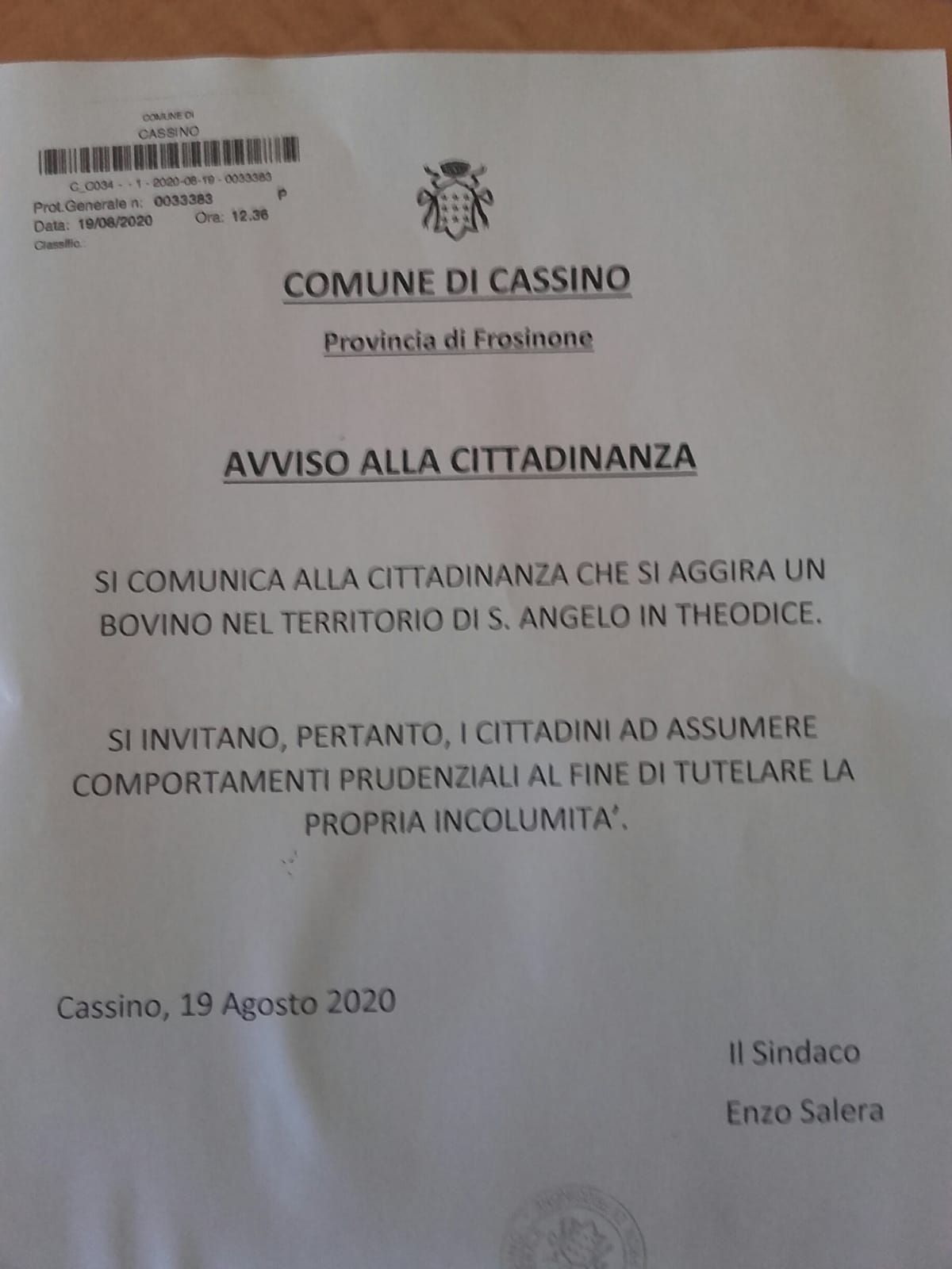 La comunicazione al Sindaco per attivare la procedura per la cattura è stata sottoscritta dal dott. Roccantonio Paliotta Moretti della Asl, nella quale si legge: “ Da ieri sera in località Sant’Angelo in Theodice del Comune di Cassino si aggira un bovino maschio meticcio privo di marca identificativa, del peso superiore ai 5 quintali.