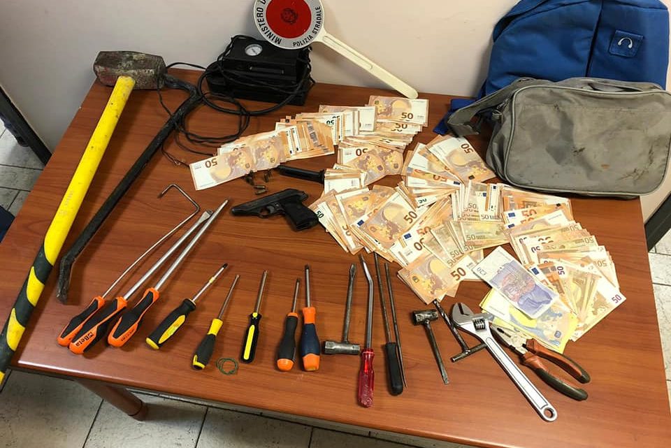 I tre soggetti erano inoltre in possesso di diversi attrezzi atti allo scasso e di una pistola calibro 7,65, carica, risultata rubata un mese prima a Carinola (CE).