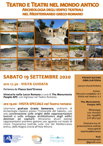 15 Settembre 2020LECCE- (Comunicato stampa). L’Associazione The Monuments People Aps in accordo con la Soprintendenza Archeologia Belle Arti e Paesaggio per le Province di Brindisi, Lecce e Taranto organizza l’evento TEATRO E TEATRI NEL MONDO ANTICO.ARCHEOLOGIA DEGLI EDIFICI TEATRALI NEL MEDITERRANEO GRECO-ROMANO.