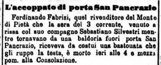 Negli vari Indici decennali dei morti del Comune di Roma (negli anni “1871-1881”, “1882-1891”, “1892-1901” e “1902-1911”) non compare nessun “Ferdinando Fabrizio”, nemmeno nelle possibili varianti del cognome, tranne un solo atto di morte di un “Ferdinando Fabrizio”, nel 1885. Costui è indicato di anni “quaranta” (quindi nuovamente anche costui come nato circa nel 1845, come il padre di Giuseppe) e come “industriante”, abitante in vita in Roma alla Via del Governo Vecchio n. 23. Ricercando negli Indici decennali dei matrimoni del Comune di Roma (fra il 1871 ed il 1911) non appare però nessun “Ferdinando Fabrizio” (o sue varianti) e nemmeno il matrimonio di un Fabrizio (o sue varianti) figlio di Ferdinando, oltre il già citato matrimonio di Giuseppe nel 1904.