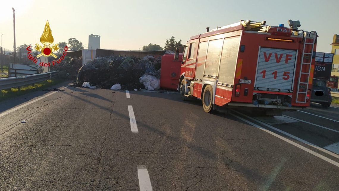 Al loro arrivo sul posto i Vigili del Fuoco hanno dovuto soccorrere una persona rimasta bloccata all’interno della cabina del suo camion che si era ribaltato invadendo tutta la sede stradale.