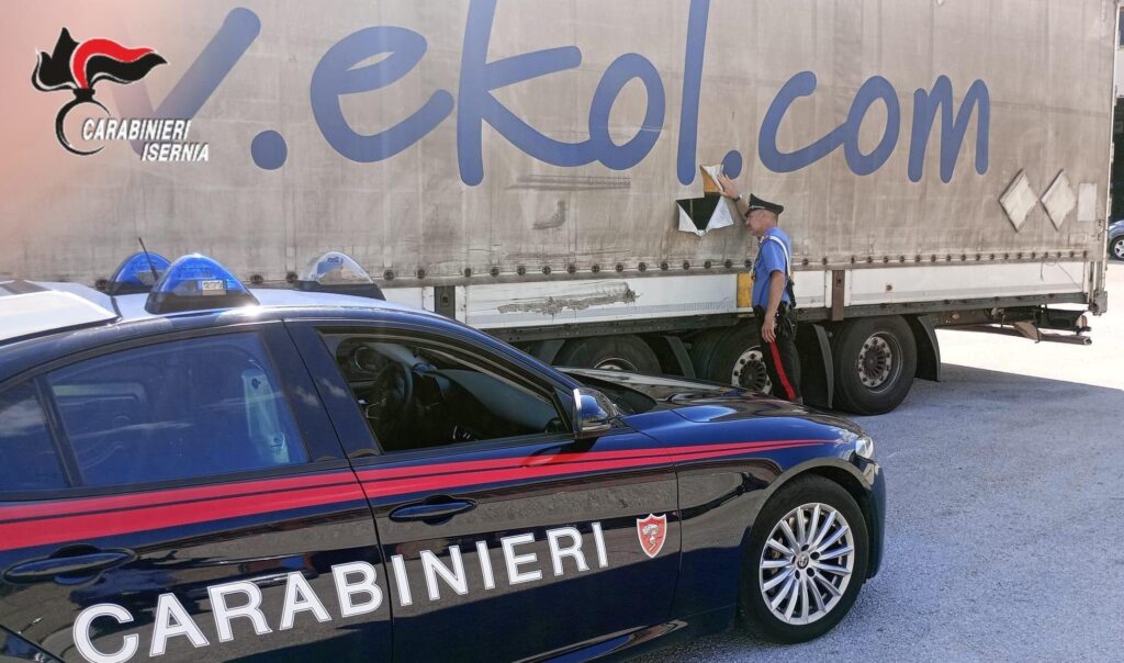 Quando la pattuglia di rinforzo raggiunge il luogo segnalato, nota un autoarticolato avente una lacerazione sul telone di copertura ed un uomo, verosimilmente l’autista, che appena scorge i Carabinieri inizia a correre nella direzione opposta.