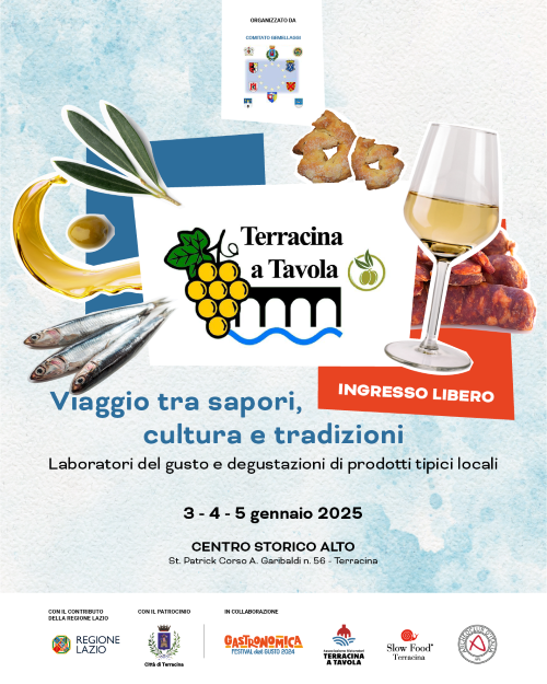 Terracina. “Terracina a Tavola. Viaggio tra sapori, cultura e tradizioni” è un progetto promosso dal Comitato Gemellaggi di Terracina, realizzato grazie al contributo della Regione Lazio, che si terrà dal 3 al 5 gennaio 2025 nel Centro Storico della città.