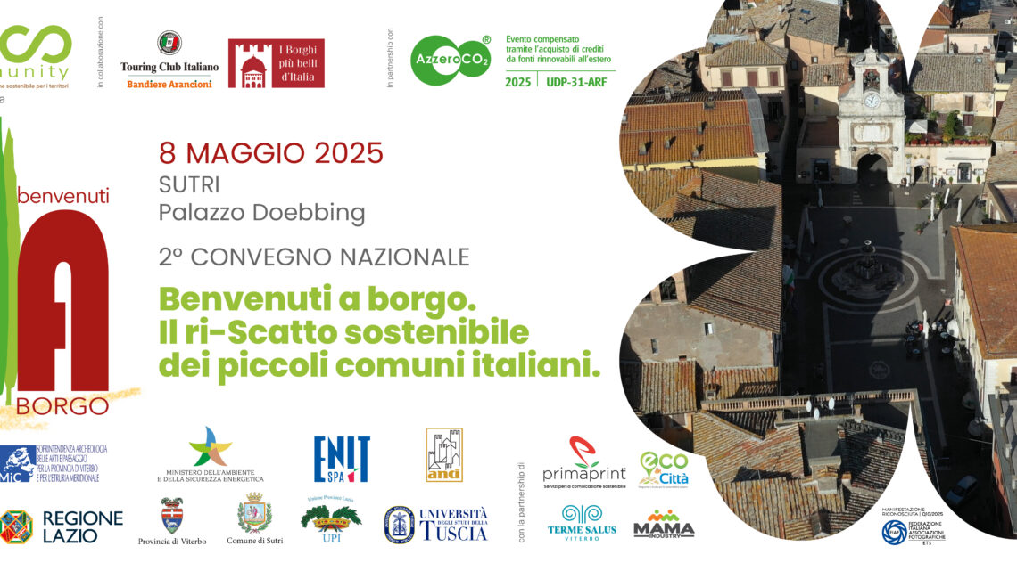 5 Maggio 2025Sutri – “Benvenuti a borgo. Il ri-Scatto sostenibile dei piccoli comuni italiani“, è un convegno ed evento espositivo che avrà luogo giovedì 8 maggio (ore 9-13) presso Palazzo Doebbing a Sutri, organizzato da ECOmmunity in collaborazione con Touring Club e I Borghi più Belli d’Italia e il patrocinio, tra gli altri, di Regione Lazio, Provincia di Viterbo, Comune di Sutri, Anci e Ministero dell’Ambiente. Un’occasione aperta ad associazioni, istituzioni, imprese e università per confrontarsi su turismo sostenibile, valorizzazione dei borghi e tutela ambientale.