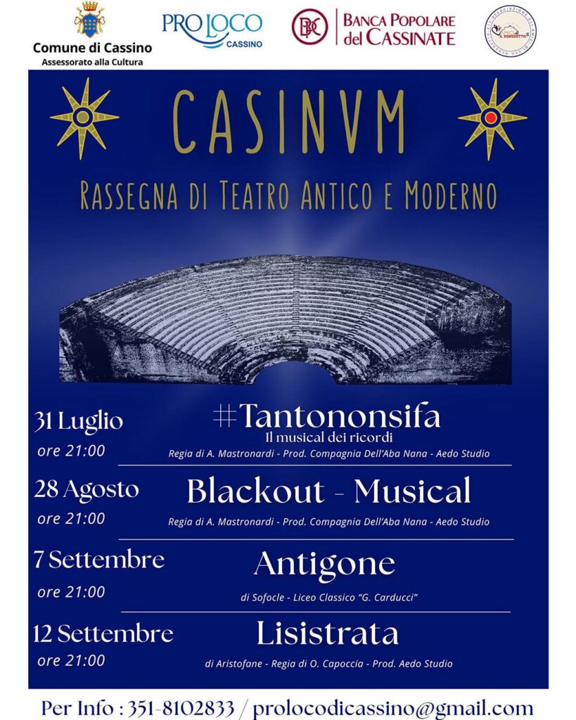 Il momento culminante dell’attività estiva sarà rappresentato dalla rassegna Casinum, elaborata in collaborazione con l’Assessorato alla Cultura del Comune di Cassino. “Desidero esprimere un particolare ringraziamento a Fortunato Redi per l’impegno profuso nell’organizzazione di questa rassegna, che rappresenta un appuntamento ormai consolidato nel panorama culturale del territorio”, dichiara il Presidente De Rosa.
