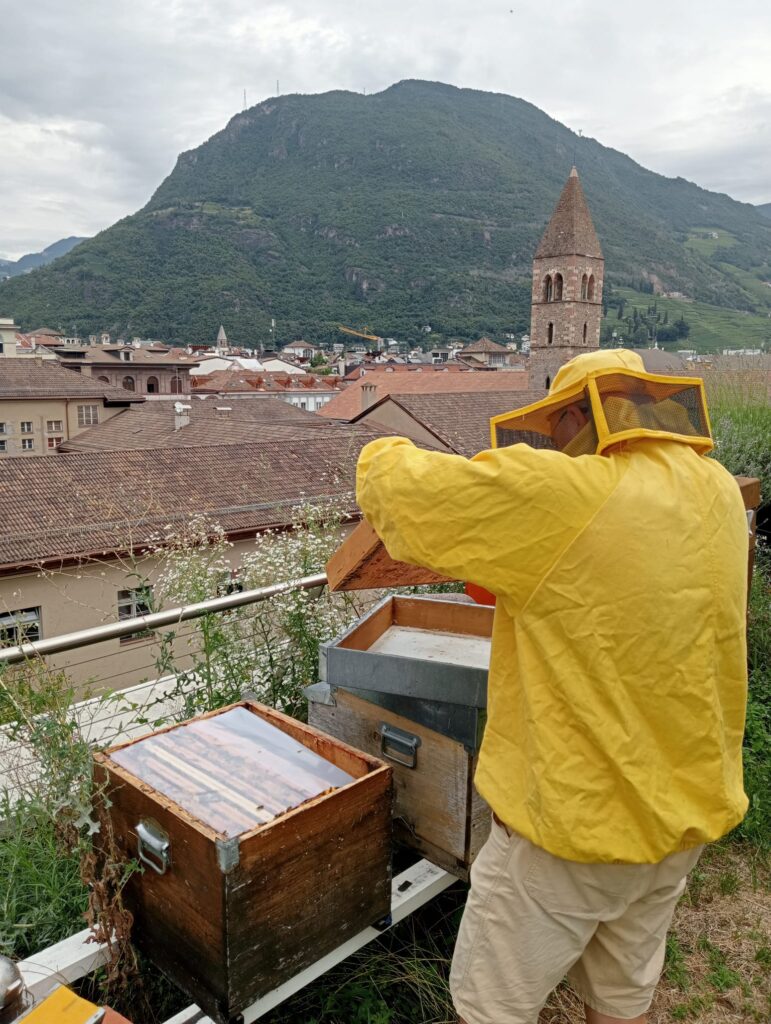 Im fünften Stock des Rainerums, einer Einrichtung der Salesianer Don Boscos, stehen gleich neun Bienenstöcke – in jedem davon „leben und arbeiten 30.000 bis 40.000 Bienen“, erzählt Don Daniele Ercoli. Er ist Seelsorger und betreut die Jugendarbeit – unter anderem das Honigprojekt. Hoch über der Straße, auf einer begrünten Dachterrasse, die so üppig ist, dass sie fast wie eine Verlängerung des Talferparks wirkt (wäre da nicht der Kirchturm der Dominikanerkirche nebenan), herrscht reger Flugverkehr: Tausende Bienen schwirren aus und ein. Daneben wachsen in großen Kunststoffkörben Melonen, Tomaten, Kürbisse und anderes Gemüse.