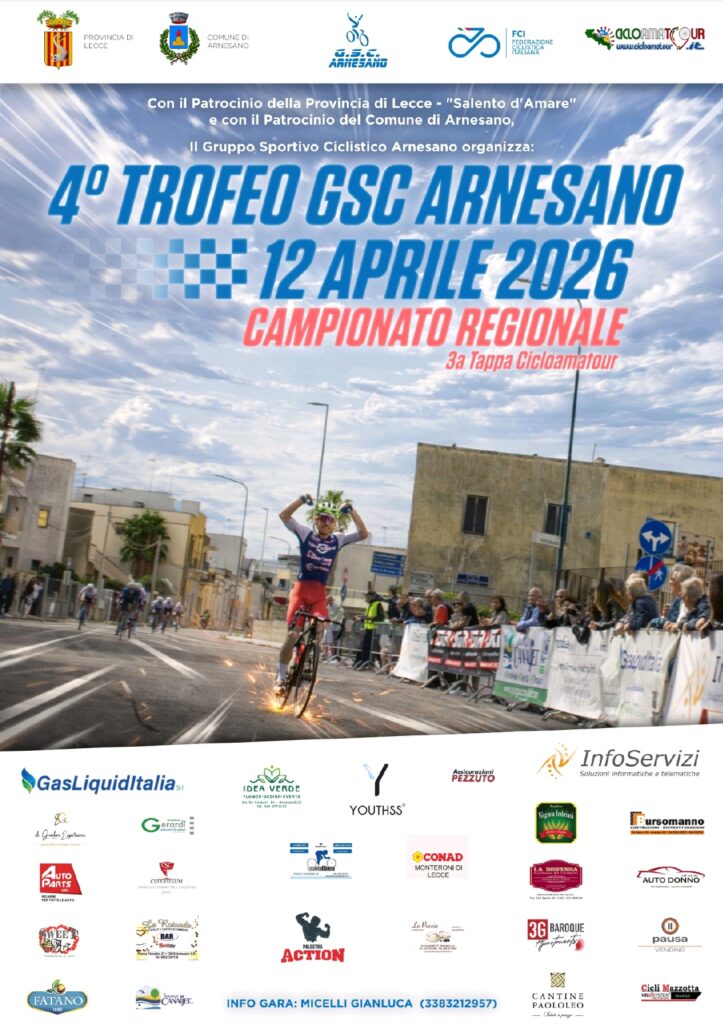 Domenica 12 aprile 2026 Arnesano, comune salentino di circa tremila anime incastonato nella pianura fra Lecce e la Valle della Cupa, torna ad essere teatro di una delle gare ciclistiche amatoriali più attese del calendario pugliese. Il 4° Trofeo GSC Arnesano, quarta edizione consecutiva di una manifestazione giovane ma già consolidata, sale questa volta di rango: è designato prova unica del Campionato Regionale FCI Puglia Master 2026, federalizzando definitivamente un evento che ha costruito il proprio profilo con coerenza e continuità.