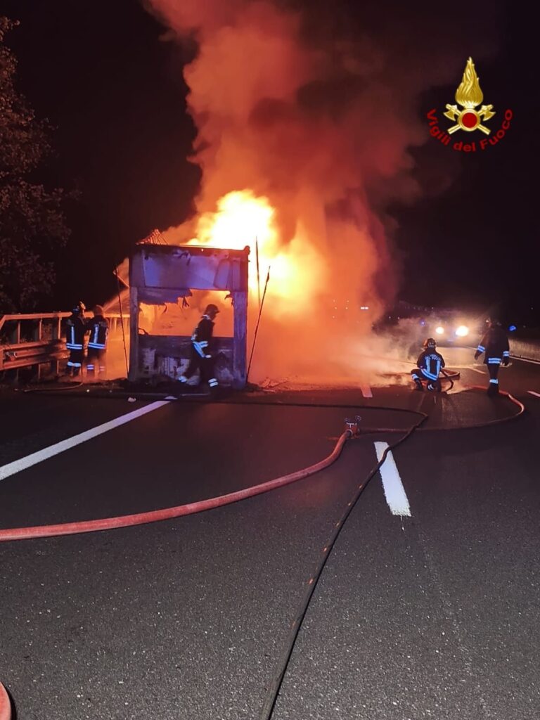 L’intervento si è da poco concluso con spegnimento del semirimorchio e la messa in sicurezza dell’area, il mezzo è stato affidato alla ditta autostradale per la rimozione.